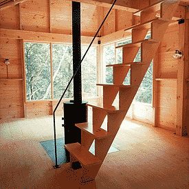 The interior is conceived as a continuous space which revolves around the wood burning stove and the stair to the loft. Argentinian black slate is inset in the floor as a base for the stove.