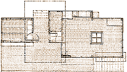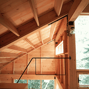 The steeply sloping roof is perceived in the loft space where exposed rafters create a linear pattern that opens dramatically into the double height of the main gathering space.